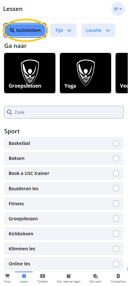 Onder ‘Lessen’ vind je alle andere lessen en trainingen, zoals groepslessen, yoga, basketbal, etc. Let op! Nieuw in het rooster van lessen is de knop ‘Activiteiten’. Deze knop fungeert als filter om je sport mee te selecteren.