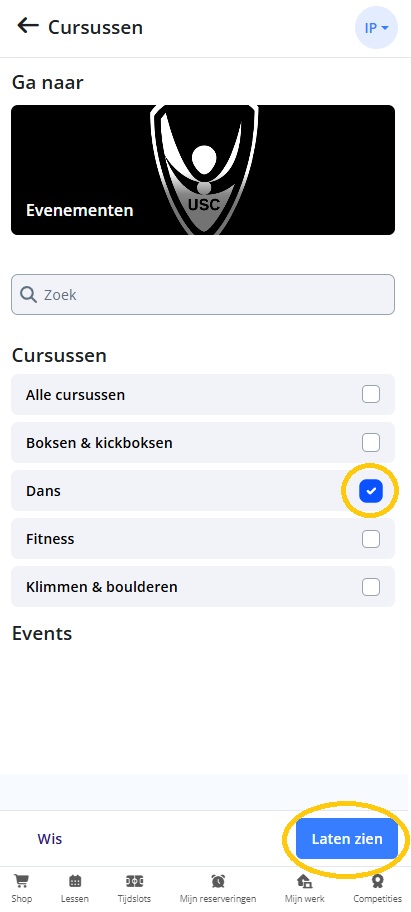 In de shop verandert er alleen iets bij ‘Cursussen’. Hier krijg je i.p.v. een enorme lijst met alle cursussen nu eerst een filteroptie om jouw sportcategorie te selecteren. Klik vervolgens op de knop ‘Laten zien’ en je krijgt een beknopter overzicht met alle cursussen uit jouw sportcategorie.